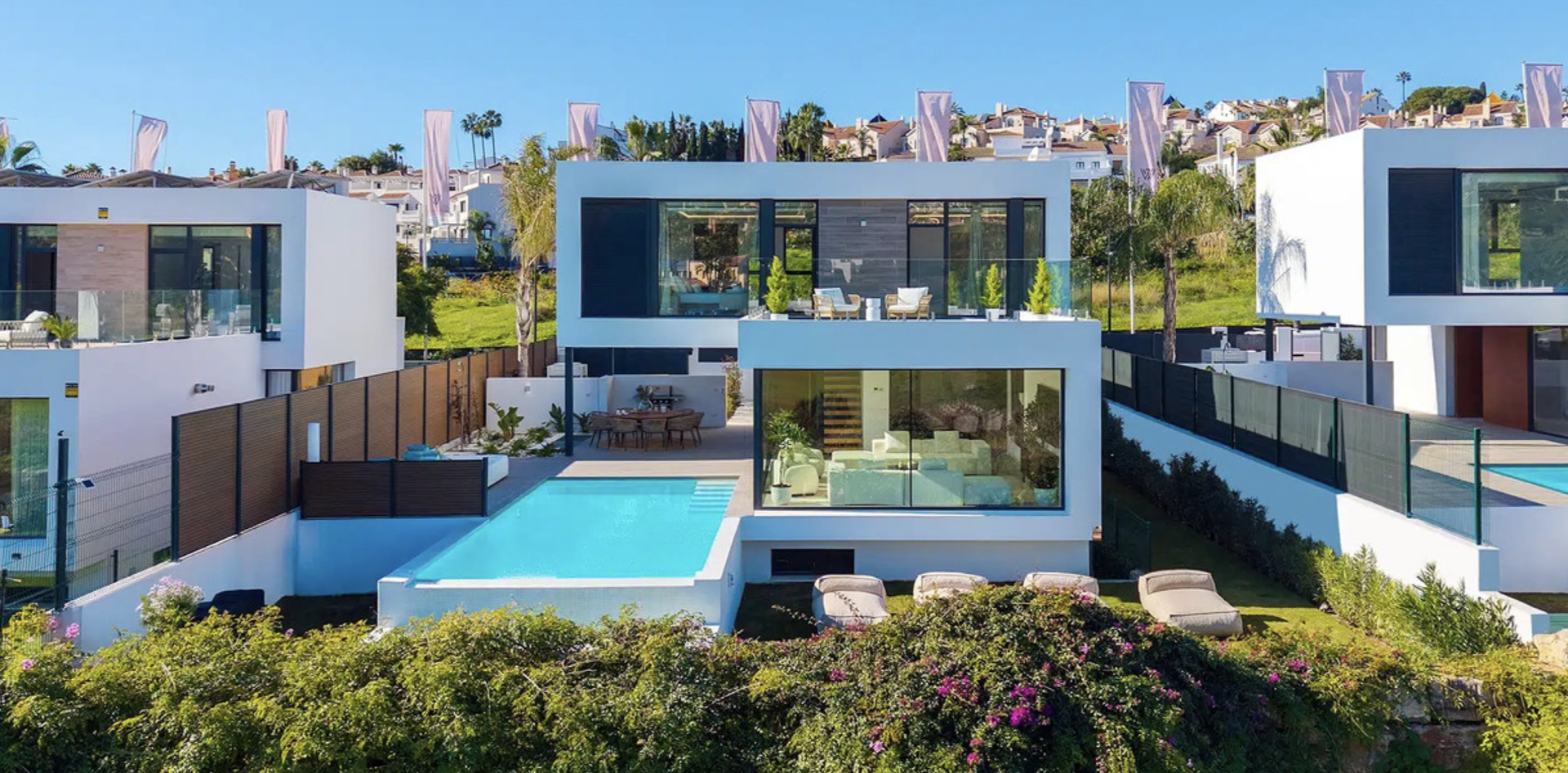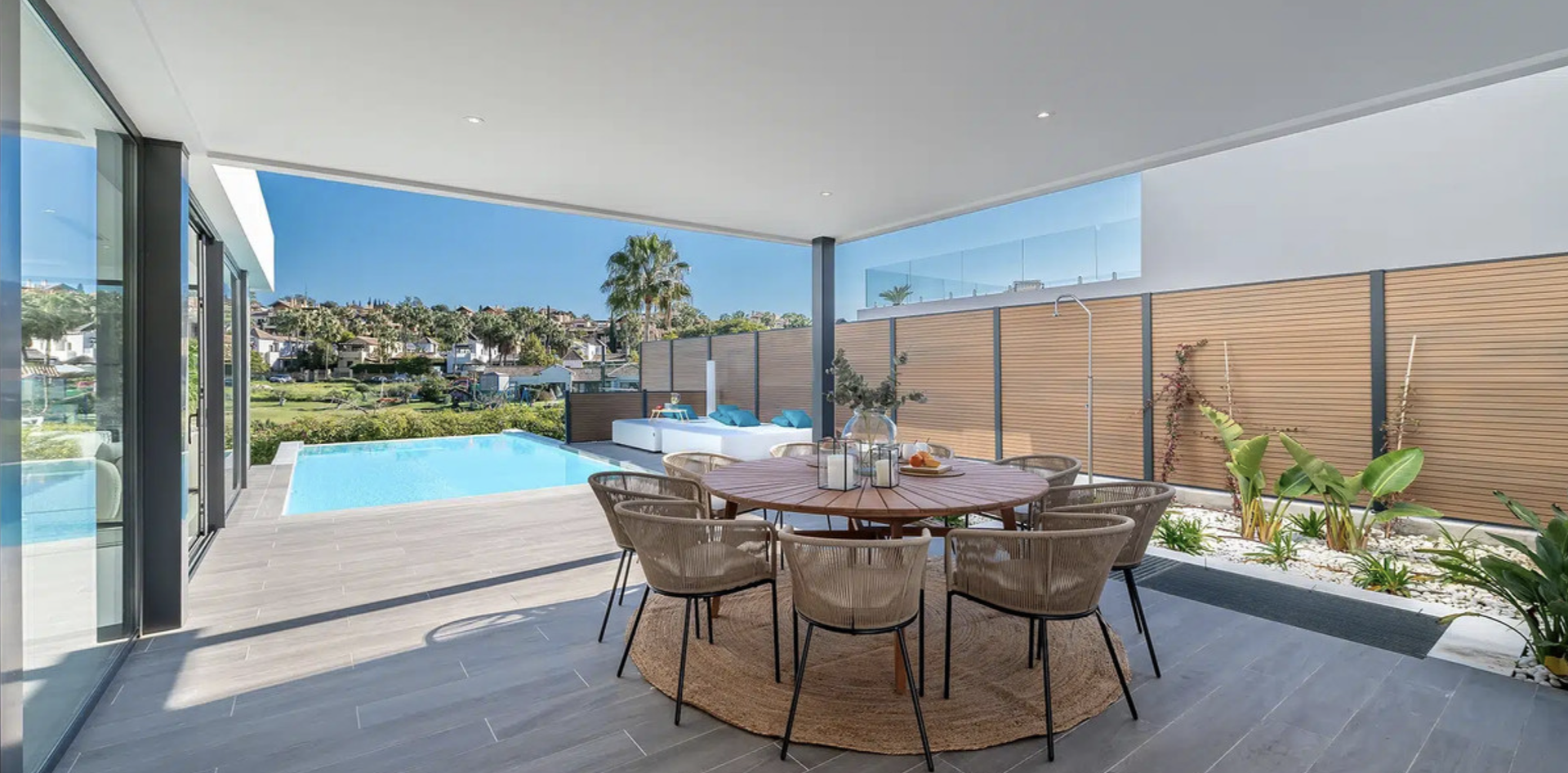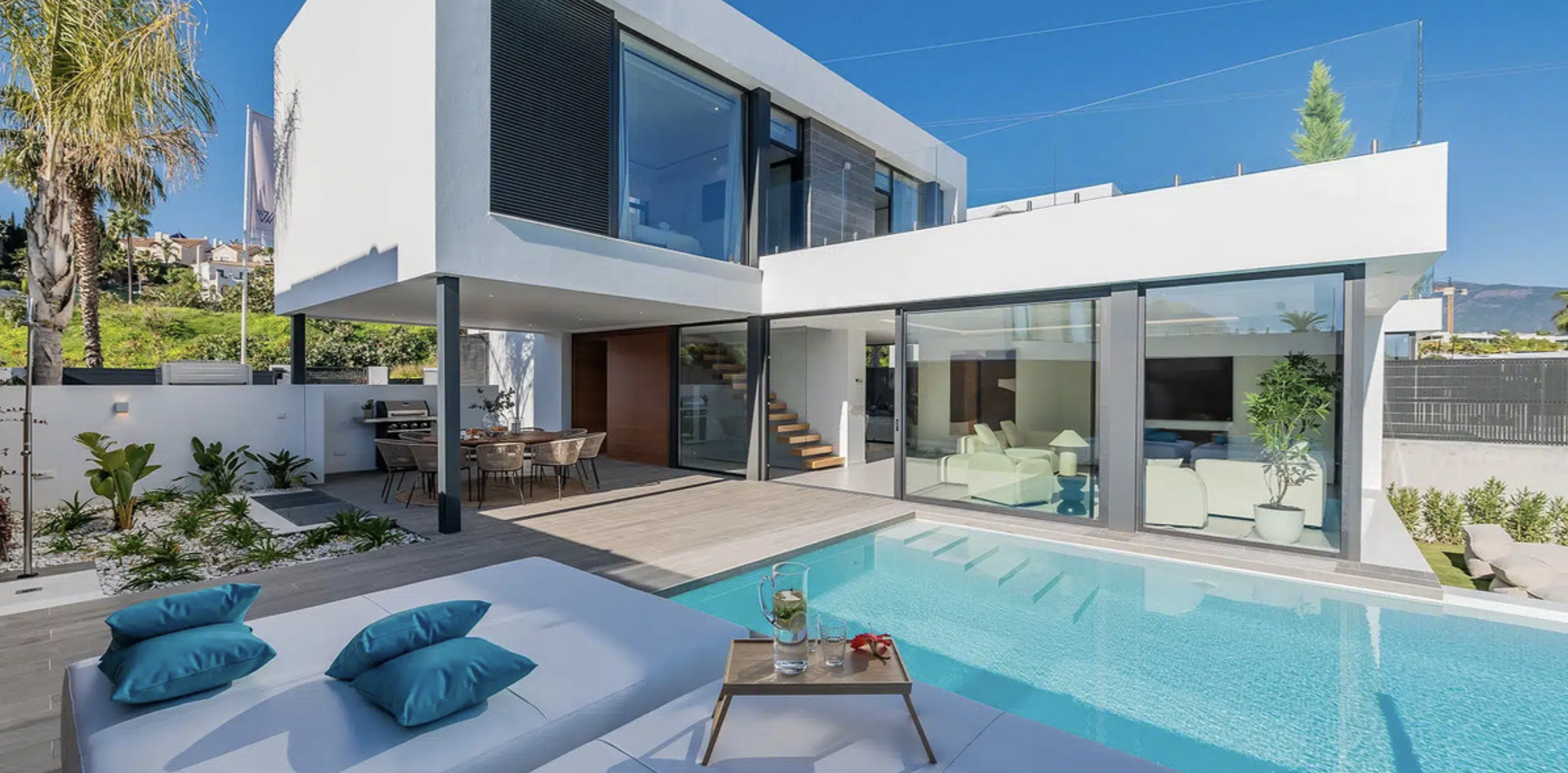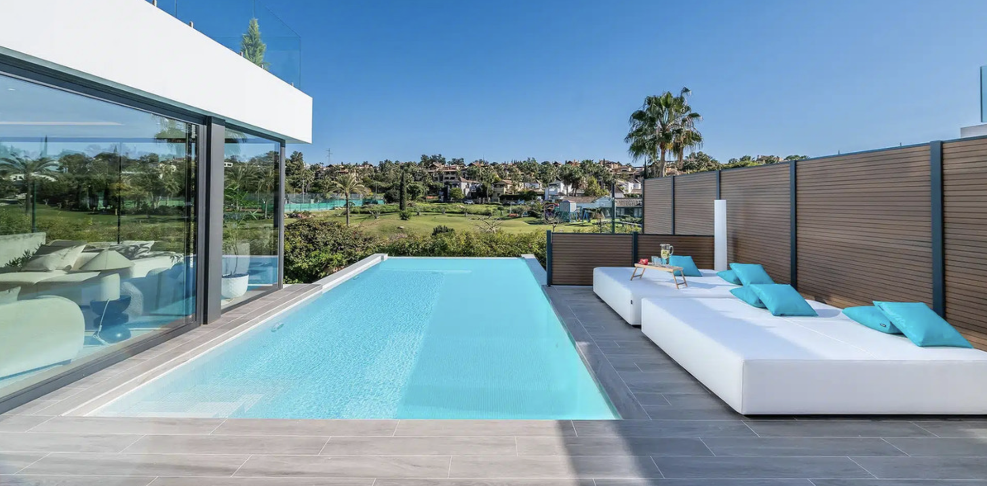Modern Frontline Golf Villa with Infinity Pool Villa Chic is a brand new, Scandinavian-inspired home set front line to El Campanario Golf. Just minutes from Puerto Banús, the beach, and top golf courses, this modern villa offers five spacious bedrooms, four en suite bathrooms, and a guest toilet. The open plan living area leads directly to a landscaped garden, a heated infinity pool, and an outdoor dining area with a built- in BBQ. Designed for comfort and style, Villa Chic features two master suites with private terraces and walk-in wardrobes. The lower level is made for entertaining with a private cinema, games area, gym, and extra bedrooms for guests. Every detail has been created for easy living and relaxed luxury. Set on a 518 m² plot with a private garage and panoramic golf views, Villa Chic offers a calm retreat close to everything. With year-round sunshine and easy access to Marbella and Estepona, this villa is perfect for those seeking modern design, prime location, and a high-end lifestyle on the Costa del Sol.