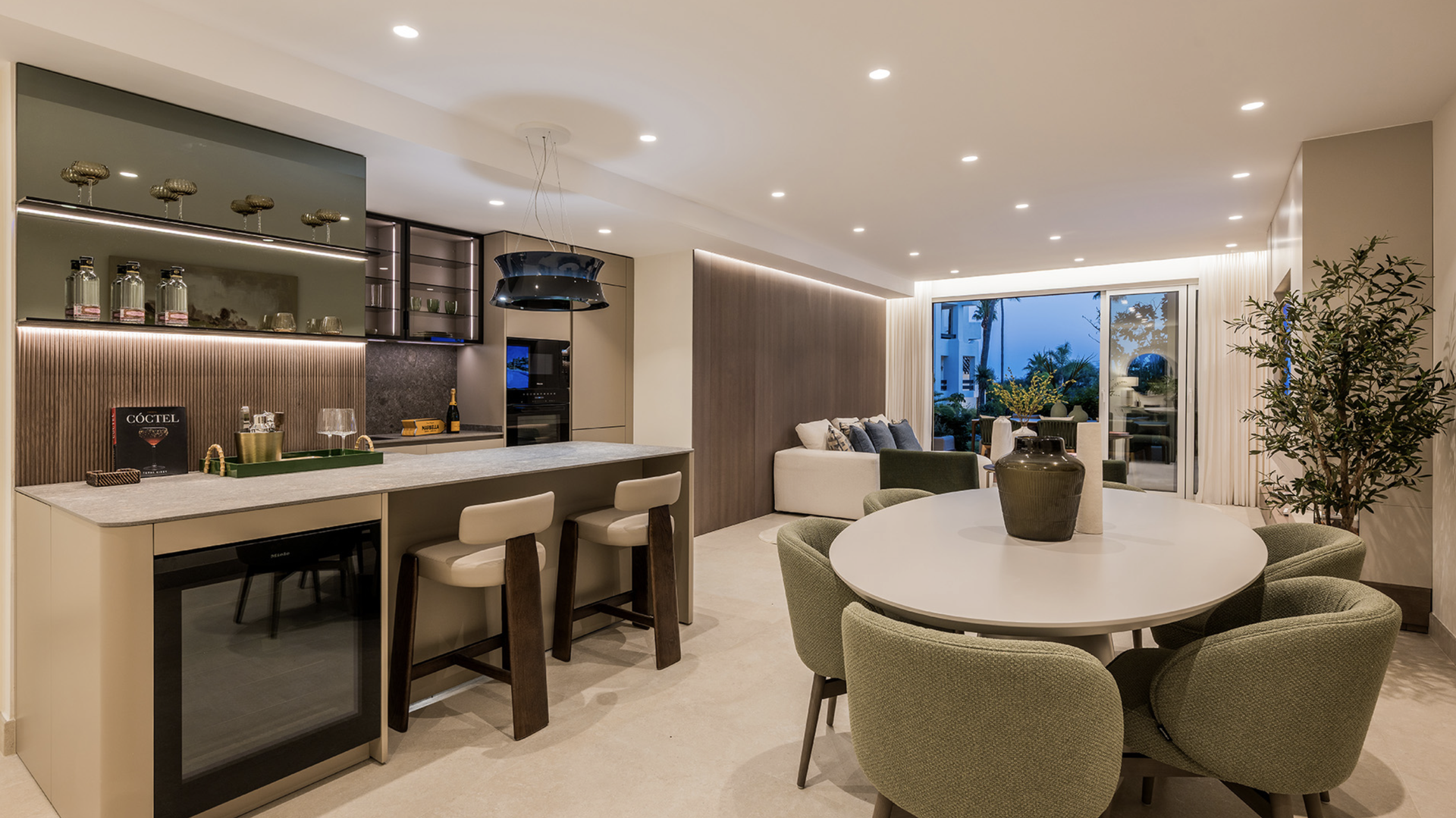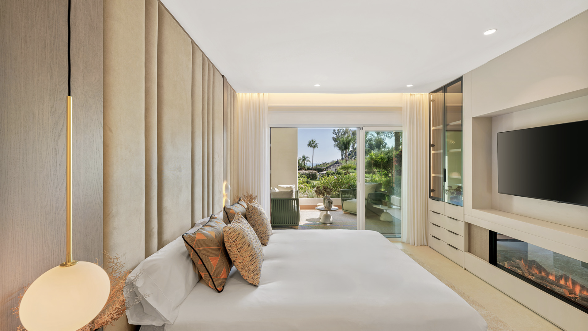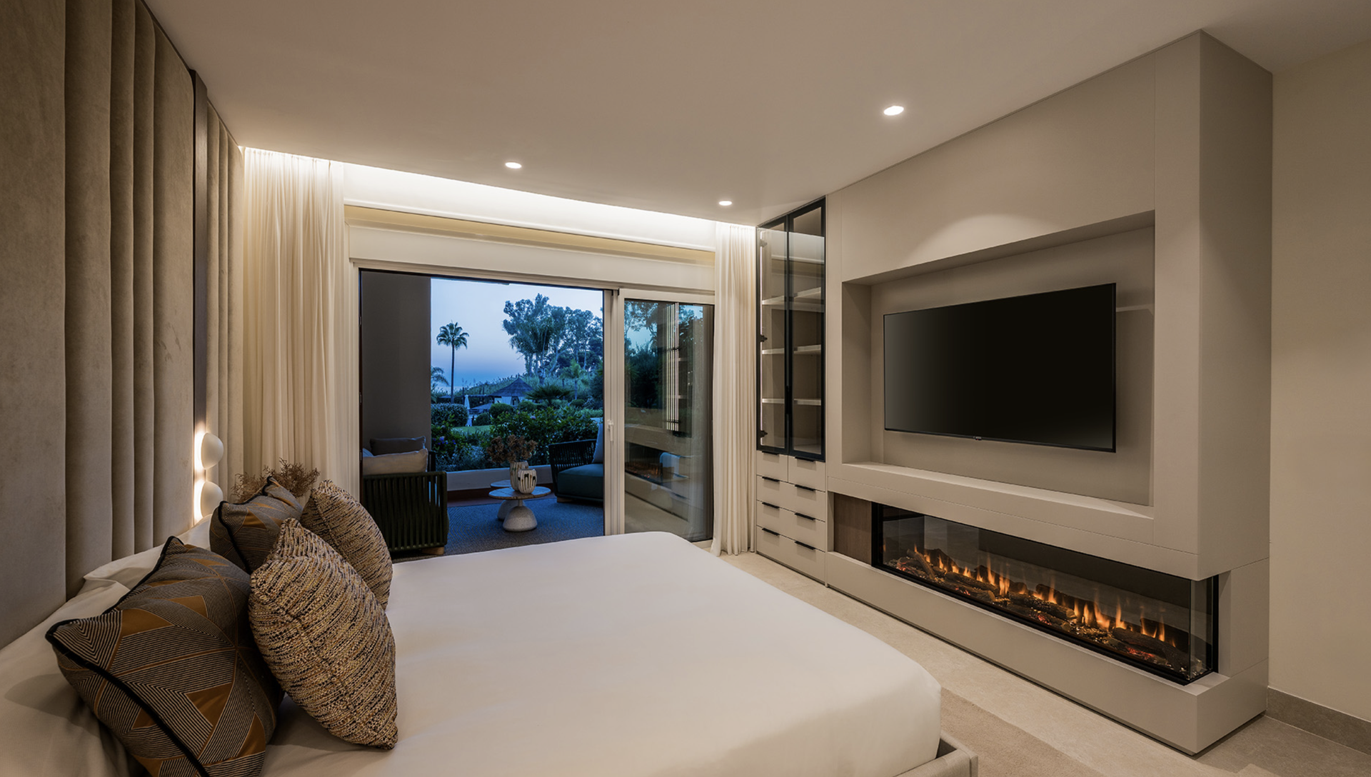 BahÍa del Velerín 3.1, Bahía del Velerín is an exclusive community situated between Marbella and Estepona. It features a stunning pool area with a snack bar, lush tropical gardens, and round-the-clock security. This prime location offers access to one of the best beaches in the region. The apartment includes an underground parking space and a convenient storage room in the basement. This ground-floor apartment offers the perfect blend of luxury and tranquility. The apartment has direct access to a private terrace and lush tropical gardens. The peaceful atmosphere of the community enhances the feeling of serenity, while the modern design of the apartment ensures comfort and style. This stunning apartment features an open-plan living space with contemporary furnishings and high-end finishes, including custom wardrobes, elegant flooring, an electric fireplace, and a Bang & Olufsen sound system. The designer kitchen is fully equipped, and the open living area leads to a private terrace with sea views. Fully furnished and ready to move in.