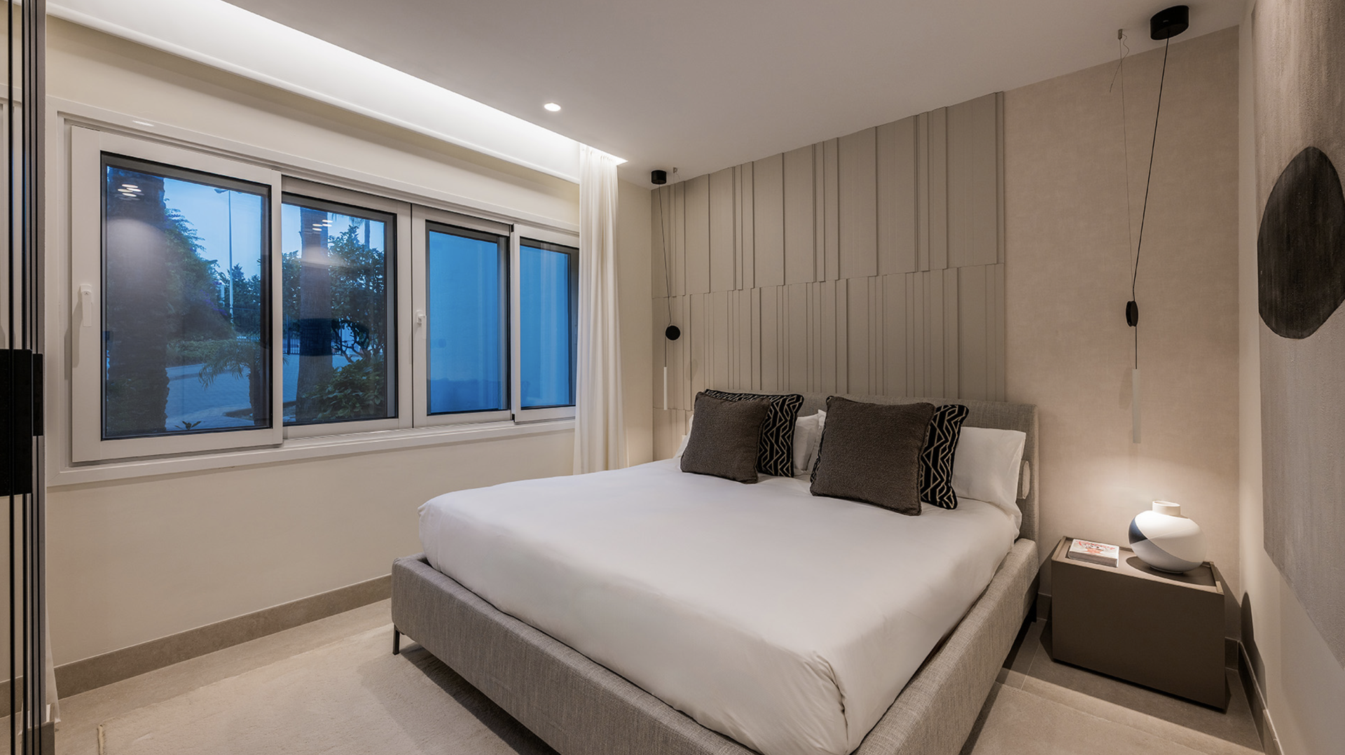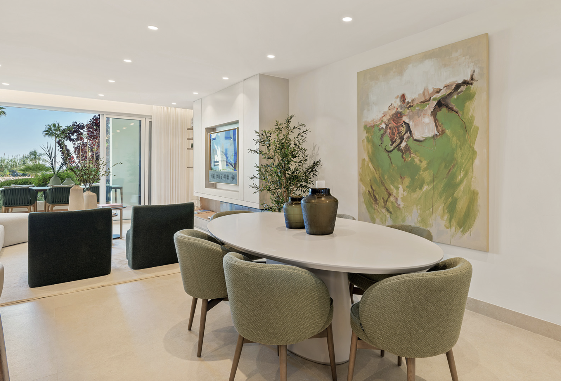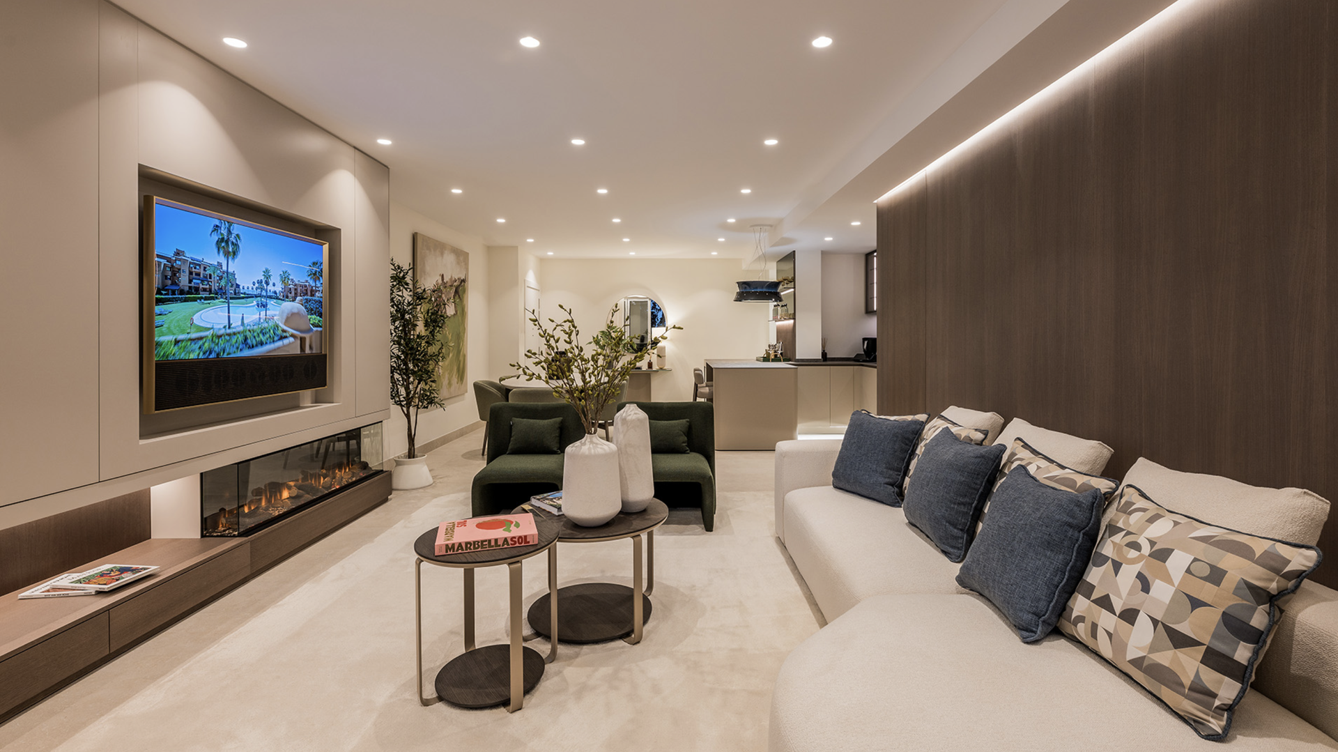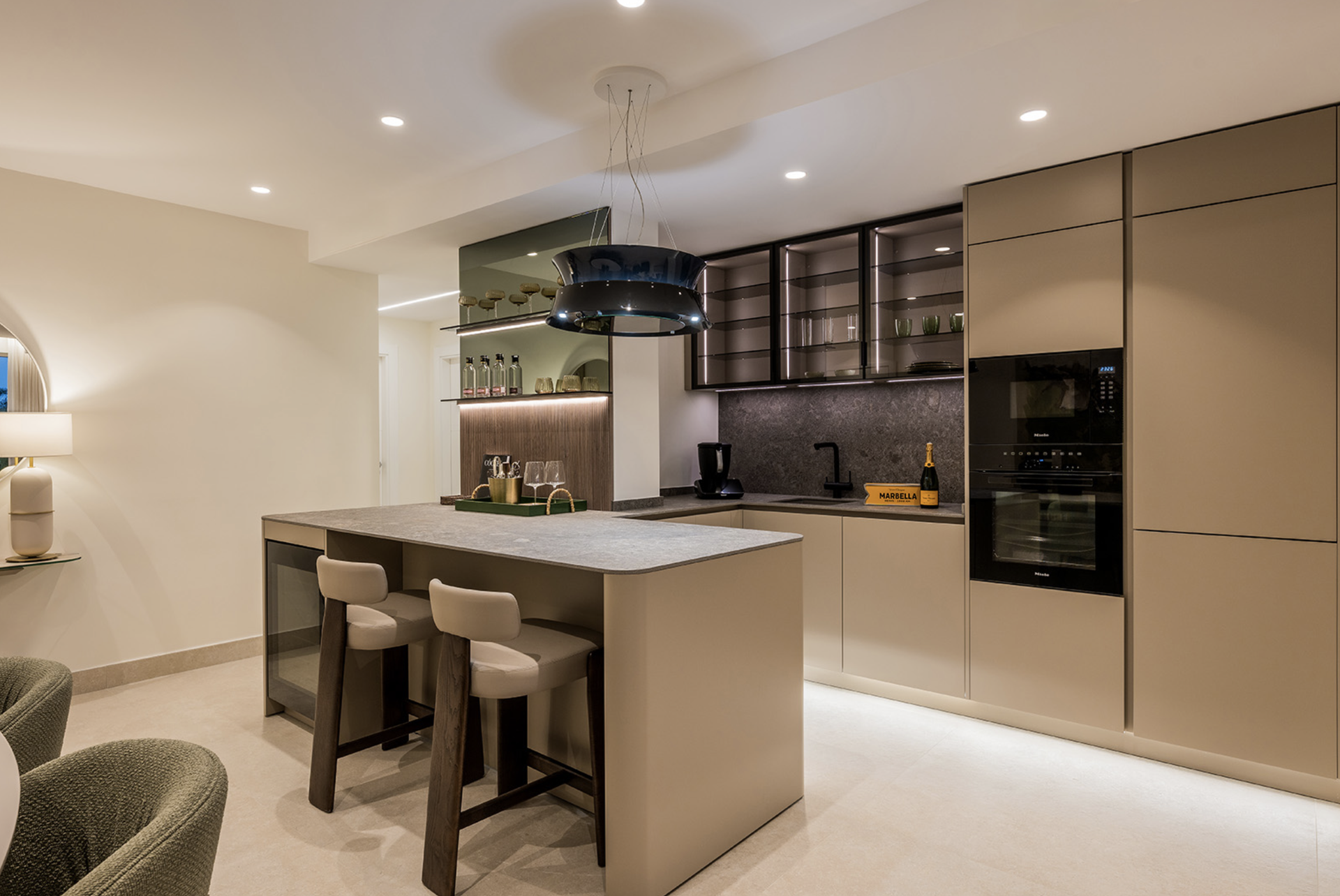 BahÍa del Velerín 3.1, Bahía del Velerín is an exclusive community situated between Marbella and Estepona. It features a stunning pool area with a snack bar, lush tropical gardens, and round-the-clock security. This prime location offers access to one of the best beaches in the region. The apartment includes an underground parking space and a convenient storage room in the basement. This ground-floor apartment offers the perfect blend of luxury and tranquility. The apartment has direct access to a private terrace and lush tropical gardens. The peaceful atmosphere of the community enhances the feeling of serenity, while the modern design of the apartment ensures comfort and style. This stunning apartment features an open-plan living space with contemporary furnishings and high-end finishes, including custom wardrobes, elegant flooring, an electric fireplace, and a Bang & Olufsen sound system. The designer kitchen is fully equipped, and the open living area leads to a private terrace with sea views. Fully furnished and ready to move in.
