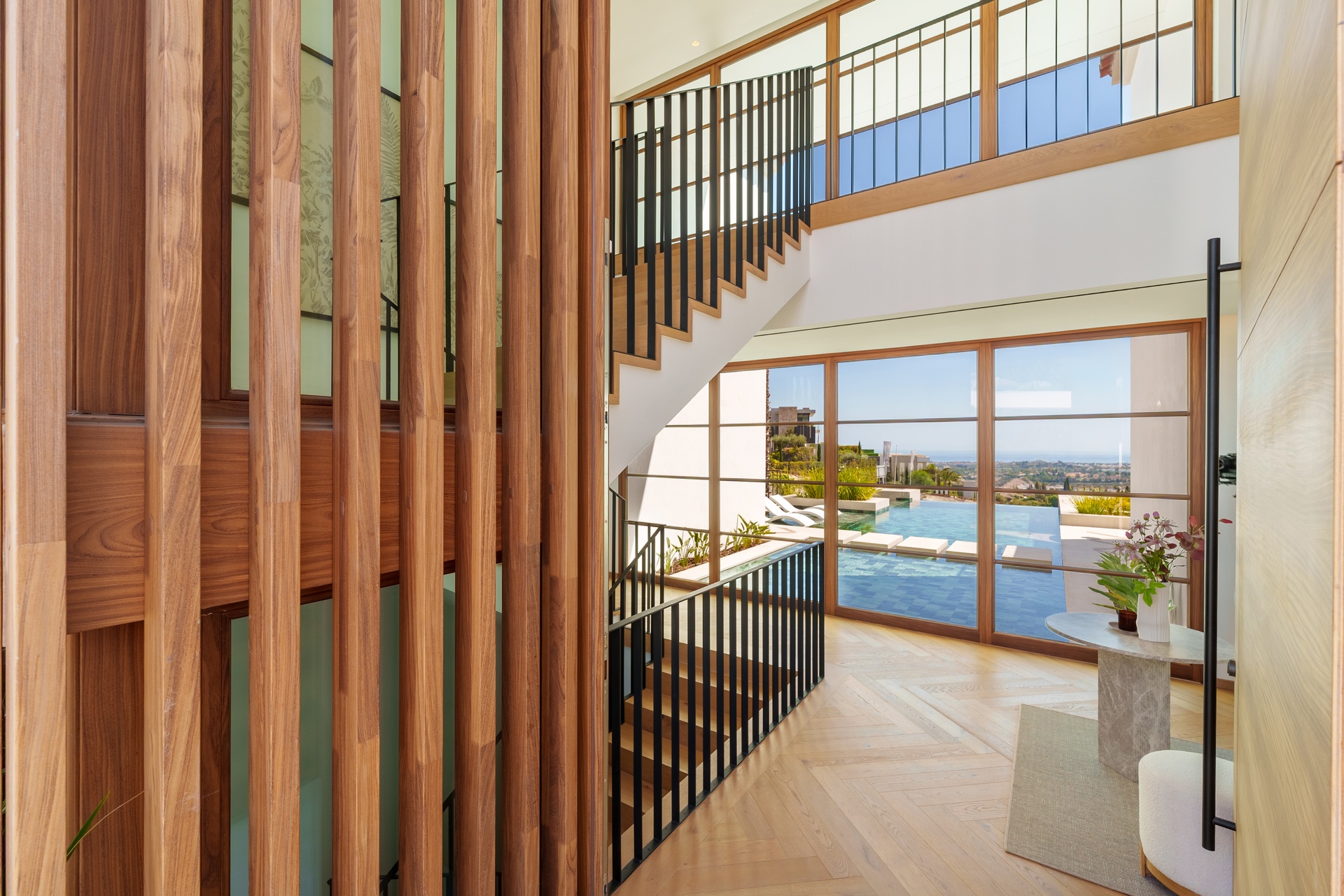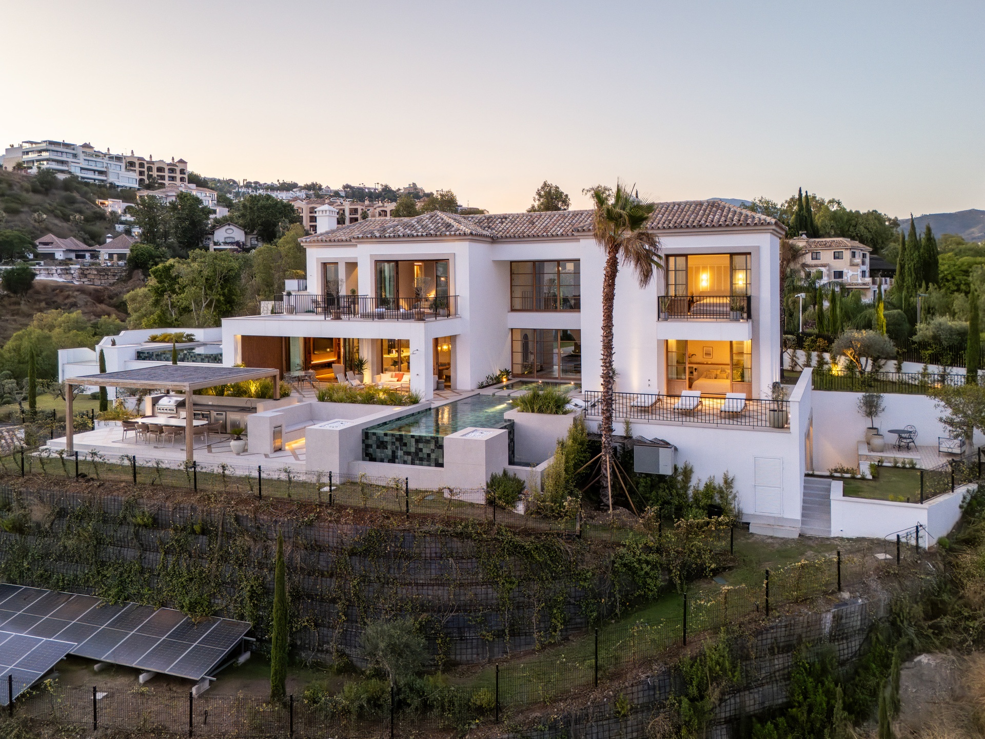 Exceptional Villa with Breathtaking Sea and Mountain Views, La Quinta. Villa Cina is situated within a prestigious 24-hour double gated community in The Hills, la Quinta, Benahavis. Nestled near the stunning Andalusian mountain range and surrounded by protected natural landscapes, this exceptional residence offers both privacy and panoramic beauty. Villa Cina enjoys a privileged position, panoramic views of the sea and mountains. Despite its tranquil setting, the villa offers convenient access to designer shopping, sandy beaches, championship golf courses, and the vibrant hubs of Marbella and Puerto Banús, just a short drive away. This elegant 5-bedroom villa is individually designed and features en-suite bathrooms, spacious and bright living areas with a fireplace, and a state-of-the-art kitchen. The master suite boasts a south-facing terrace, while the four guest bedrooms are also en-suite. Additional highlights include a wine cellar, entertainment room, gym, massage room, three guest toilets, laundry room with four machines, and now a private elevator, adding ease and comfort to daily living. The private saltwater pool is complemented by a south-facing terrace, a lounge area, a fully equipped outdoor BBQ kitchen, and a stylish chill out zone perfect for embracing the Mediterranean lifestyle. To relax and unwind, the entertainment room features a billards table and a cozy TV lounge. The villa also includes a fully fitted gym, a large wine cellar, a generous laundry and storage room, private parking, and easy-to-maintain tropical gardens. Smart technology enhances comfort and convenience, with a home intelligence system compatible with Apple HomeKit and the Lutron app. The villa has been built with energy efficiency as a priority and holds an Energy Efficiency certificate A, reducing environmental impact and utility costs. Additional features include underfloor heating throughout, individually controlled A/C in each room, and a lifestyle deeply connected to nature. Residents of La Quinta can enjoy outdoor pursuits such as hiking, trekking, and horse riding, all set against breathtaking sea and mountain views adjacent to the Unesco declared Biosphere Reserve. Villa Cina offers an unmatched blend of elegance, innovation, and natural beauty in one of Costa del Sol's most sought after locations.
