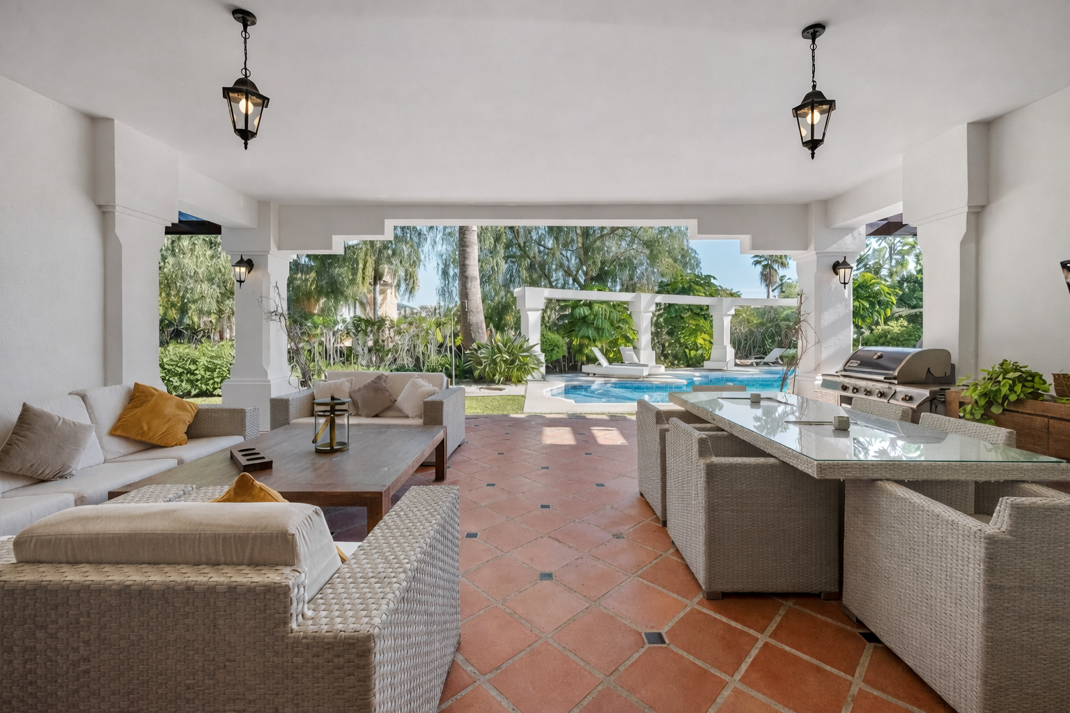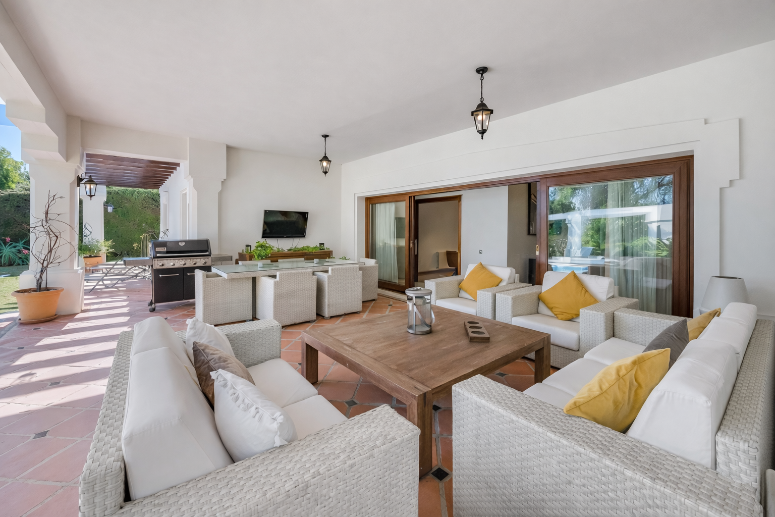 Onberispelijke mediterrane villa in de exclusieve golfvallei van Nueva Andalucía. Deze mediterrane villa op het zuidoosten ligt in de prestigieuze wijk Nueva Andalucía en biedt een uitzonderlijke bouwkwaliteit in het hele huis, met vrij uitzicht over de privétuinen, een mooi zwembad en de berg La Concha. Een zeer gewilde locatie, met winkels, restaurants, supermarkten en dagelijkse voorzieningen op loopafstand, en Puerto Banús op slechts vijf minuten rijden. De begane grond verwelkomt u met een ruime hal die leidt naar een royale woon- en eetkamer. Houten plafonds van vijf en een halve meter hoog, een marmeren en houten open haard en brede ramen creëren een lichte, comfortabele ruimte die direct uitkomt op de tuin en het zwembad. Vanaf het overdekte terras kunt u genieten van barbecues in de open lucht of kijken hoe het gezin zich ontspant bij het zwembad. Een klein parkachtig gedeelte in de tuin voegt charme en privacy toe. De keuken-eetkamer is zowel elegant als praktisch, met een centraal eiland met Silestone-werkblad, hoogwaardige apparatuur en meerdere toegangspunten. Aan de ene kant kijkt u uit op een patio met een fontein in Andalusische stijl en een prachtige citroenboom, terwijl dubbele glazen deuren leiden naar een overdekte veranda, ideaal om buiten te eten. Op deze verdieping bevinden zich ook twee slaapkamers met eigen badkamer, inbouwkasten en loftruimtes met houten vloeren, perfect voor gasten of tieners. De eerste verdieping is gewijd aan de master suite, met hoge houten plafonds, een privéterras met uitzicht op de tuin en het zwembad, een kleedkamer met verlichte kasten en een ruime badkamer met hydromassagebad en aparte douche. De semi-kelderverdieping biedt twee tweepersoonsslaapkamers met natuurlijk licht vanuit Engelse patio's en een gedeelde complete badkamer. Extra ruimtes zijn onder andere een wasruimte, wijnkelder, slaapkamer voor personeel met badkamer, snookerkamer en een fitnessruimte met sauna en complete badkamer. De villa is gebouwd met materialen van topkwaliteit en oog voor detail en beschikt over Iroko-houten buitenkozijnen met dubbele beglazing, walnoothouten binnenkozijnen, ivoorkleurige marmeren vloeren, radiatorverwarming in het hele huis en centrale airconditioning. Dubbele garage en parkeerplaats voor maximaal zes auto's. Een stijlvolle woning met karakter in een van de meest gewilde woonwijken van Marbella. Een zeldzame combinatie van ruimte, kwaliteit en locatie.